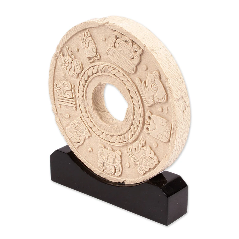 During the Classic period, the Maya observed cyclical time through the Calendar Round, in which the Tzolkin or 260-day ceremonial calendar intermeshed with the Haab or 365-day yearly calendar to produce the 52-year cycle so important in Mesoamerican religion. However, they also recognized the need to record linear time as well, observed through the Long Count, in which the current era was calculated from a hypothetical date of 3114 B.C. Elisa Camarena represents date glyphs on this beautiful replica sculpture.