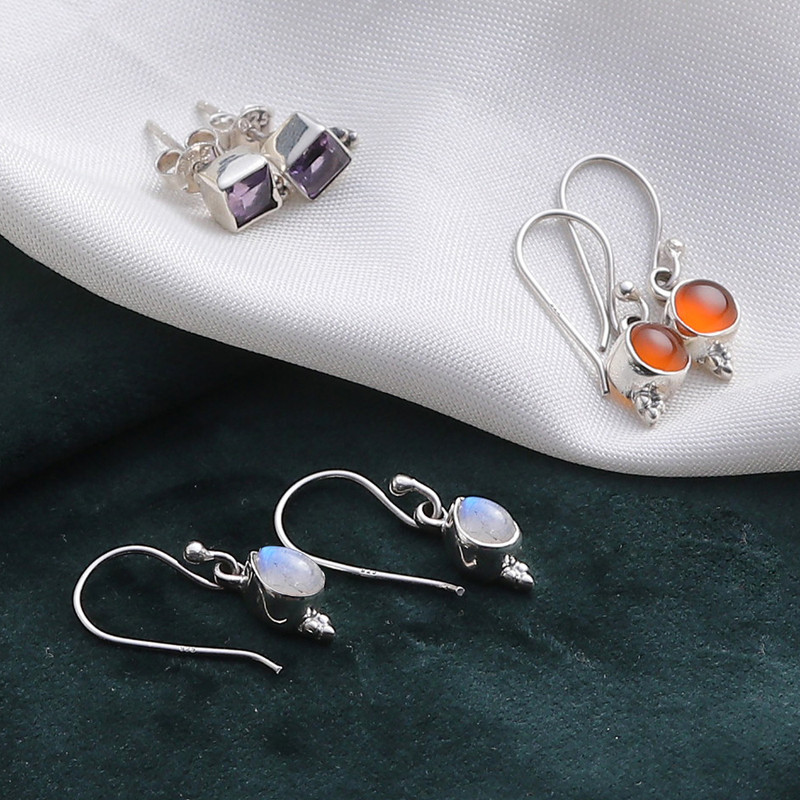 Made to transform your ensembles into statements of majesty and grace, this set of three sterling silver earrings sparkles with India's high-quality jewelry arts. Presented by Narayannii and crafted by talented artisans, the set includes three gemstones: round carnelian, square amethyst and drop-shaped rainbow moonstones. The accessories are also equipped with hooks and posts.