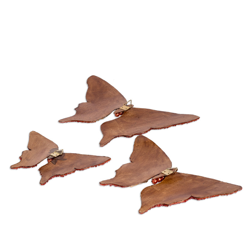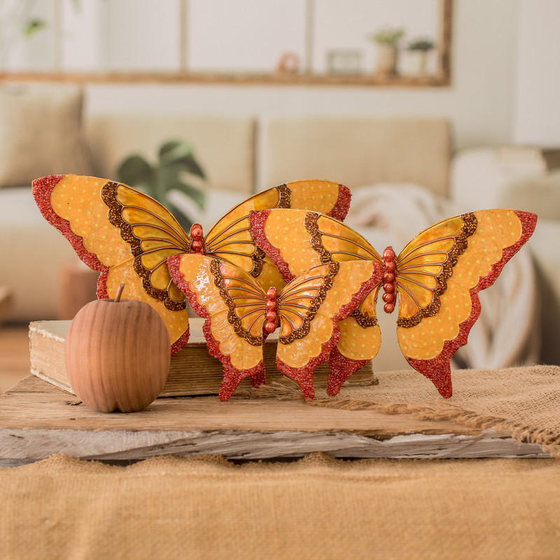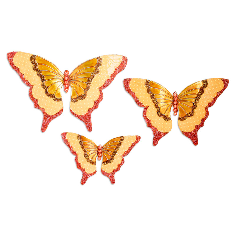 Delivery EstimateRed, brown and golden hues announce the arrival of prosperous and harmonious times while decorating this magical creation by Roxana Alas from El Salvador. The artisan works on plasterboard structures, accenting them with repoussé aluminum sheets that complete this set of three butterfly-themed wall accents with a magical illusion. After adding some decoupage details to enrich the pieces' enchanting vibe, the final touch comes in the form of plastic and glass beads, adorning the wings with a charming look.