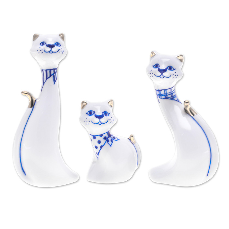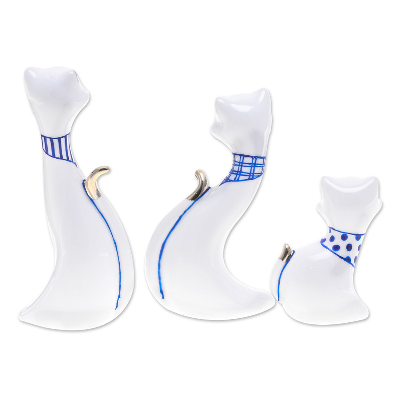Backed by our 100% Happiness GuaranteeGenuine gold gilded accents take this adorable set of three porcelain cat statuettes to another level. This charming addition to your home decoration features a family of smiling cats delicately hand-painted with blue motifs and embellished with 2.6k gold gilt accents on the ears, tail and toes in a charming design by Thai artisan Panida Tamjun.