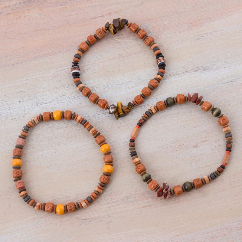 Backed by our 100% Happiness GuaranteeThese beaded bracelets make striking and trendy companions wherever they go. Artisans from the Andean highlands handcraft the three stretch bracelets with tiger's eye and stamped beads of ceramic in earthy tones. Dina presents her own designs in these bracelets.