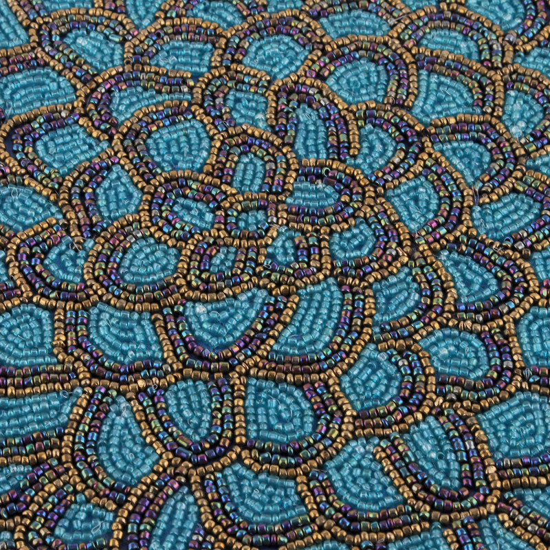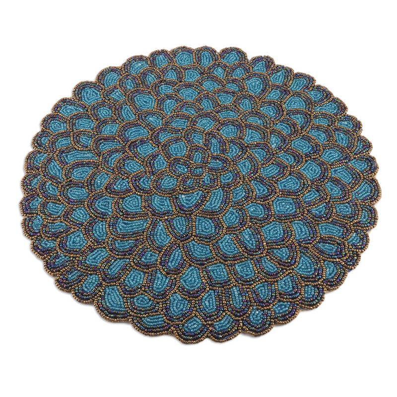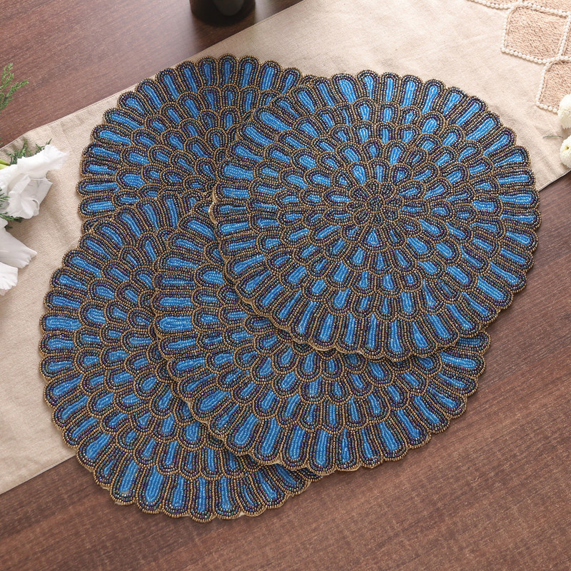 Inspired by the vibrant beauty of peacock feathers, this set of four placemats captures their glory through intricate teal, blue, and golden glass beads, delicatelyarranged to bring a touch of artistry to any table setting.