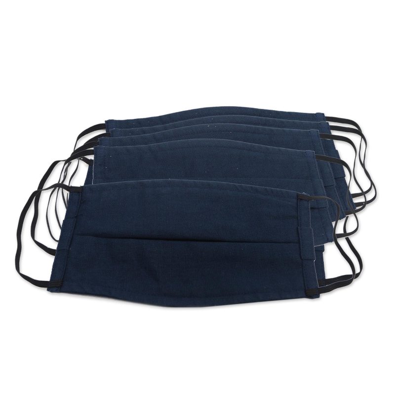 Novica artisans craft this set of five double-layer blue cotton face masks with three pleats for comfort. They are washable and reusable, and feature elastic to loop over the ears.