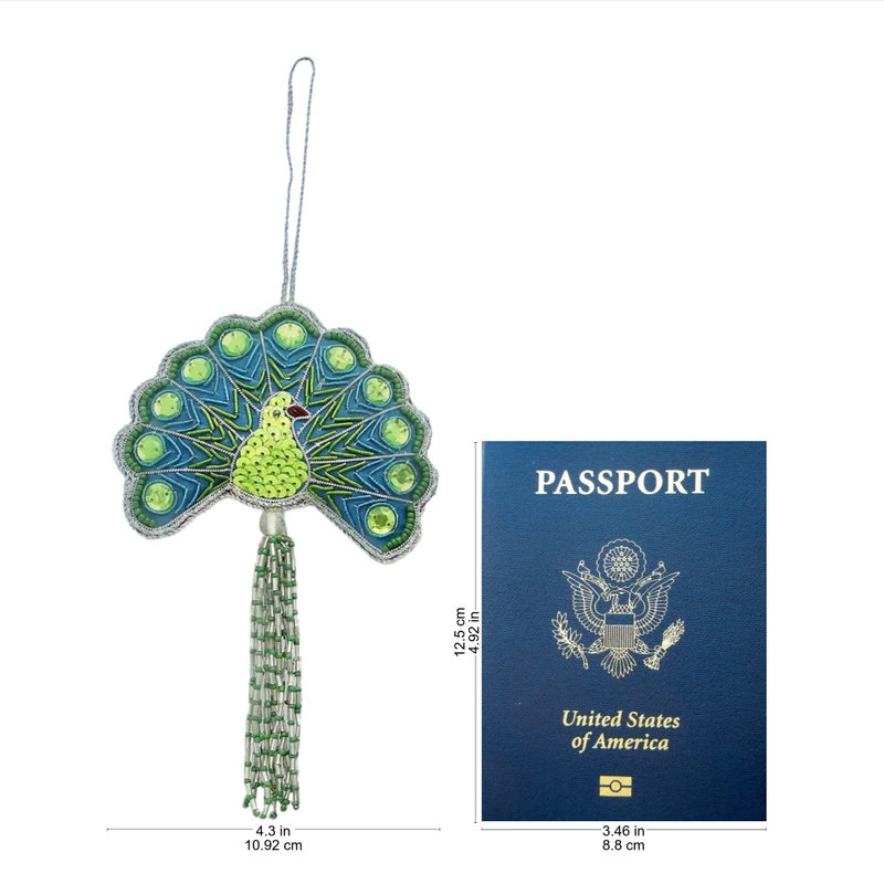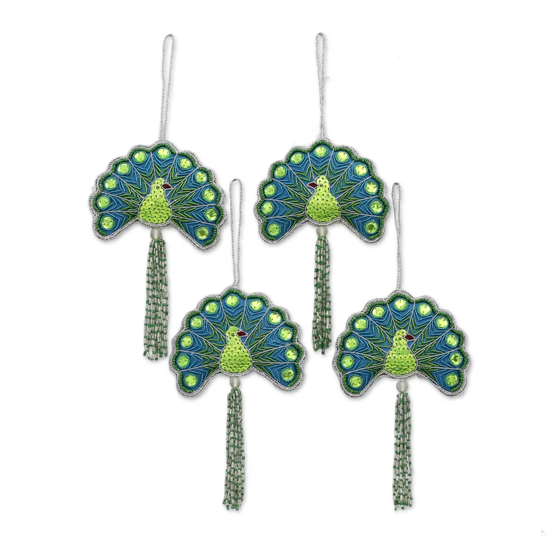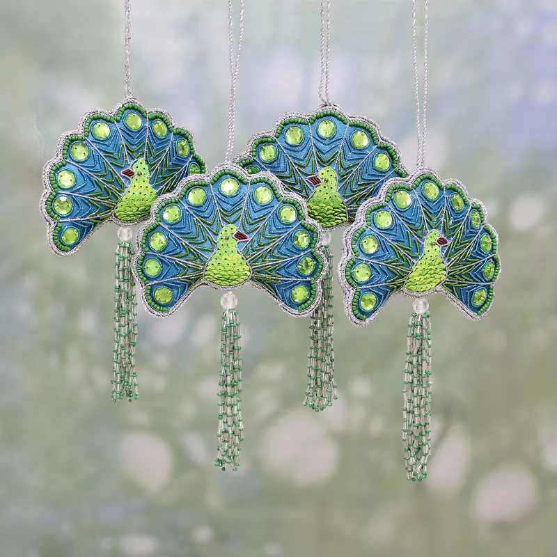 Indian artisans craft this beautiful set of four ornaments, adorning the tree with brilliance. Decorated with beads and sequins in green and teal colors, each ornament takes the form of a glorious peacock with a tail of beads that dangles beneath. The ornaments are accented with silver-tone zari thread in the zardozi style. An organza pouch for storage accompanies the ornaments.