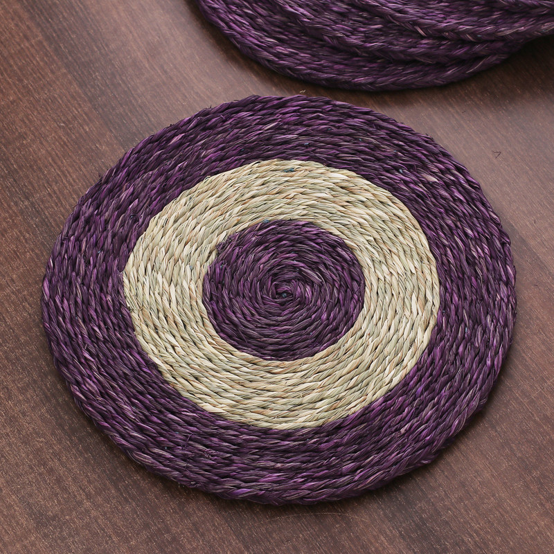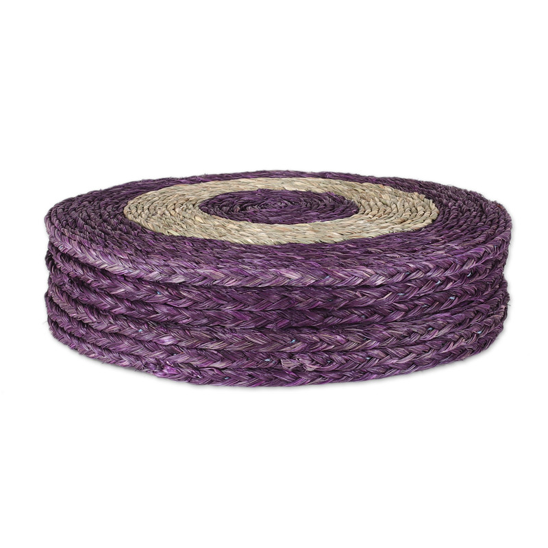 An essence of natural elegance and graceful sophistication comes from this set of six placemats by Papiya Das of India. The artisan works with traditional techniques to handweave these round pieces in a palette of purple and natural hues—all made from sabai grass fibers. Displaying a captivating pattern, the accessories are also sturdy.