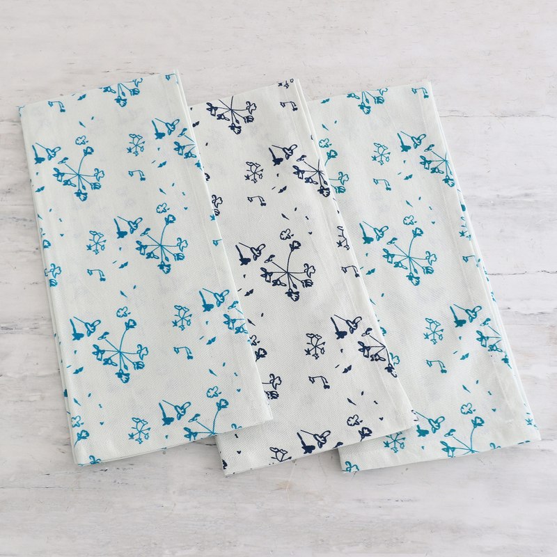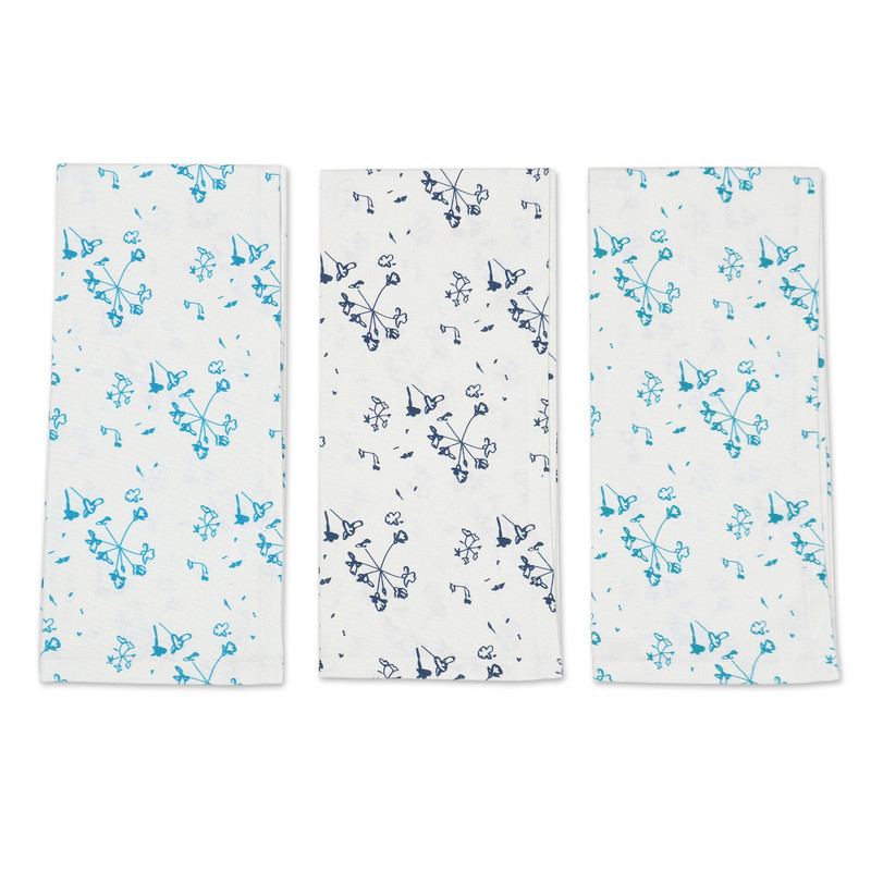 Backed by our Happiness GuaranteeLittle flowers in cyan, navy and teal hues adorn a set of three cotton dish towels crafted by Seema's artisan team. After crafting each accessory with a soft textile, the Indian artisans crown them with printed floral patterns for a tender style.