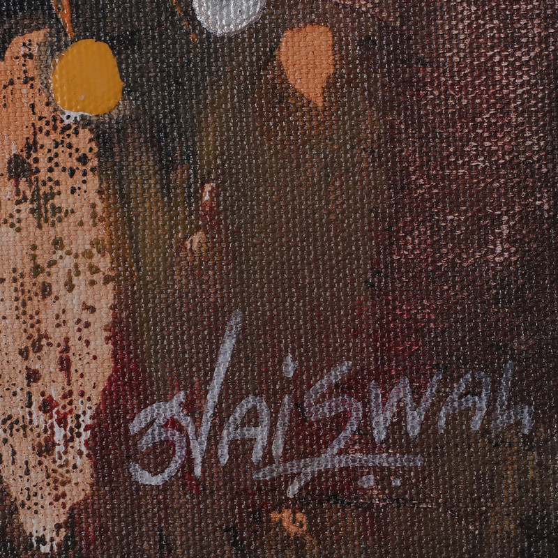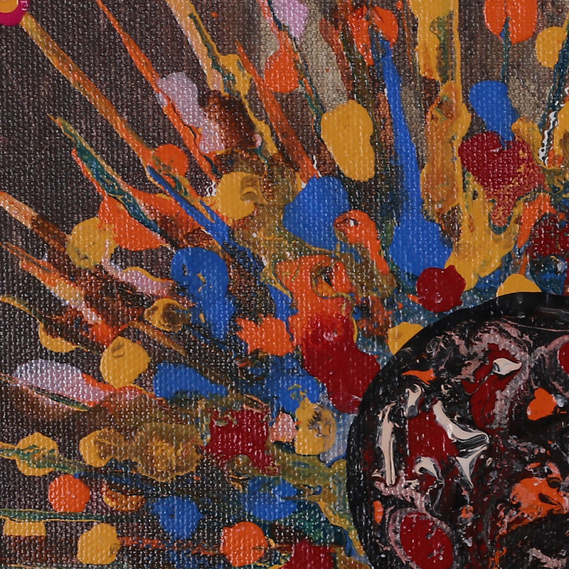 The universe dances to an enigmatic and captivating tune in an expressionist composition by India's Sunil Jaiswal. Known for conveying mystery through the combination of intense hues, Sunil uses acrylic on canvas to create this sublime piece that portrays a planet surrounded by explosions of color and warmth.