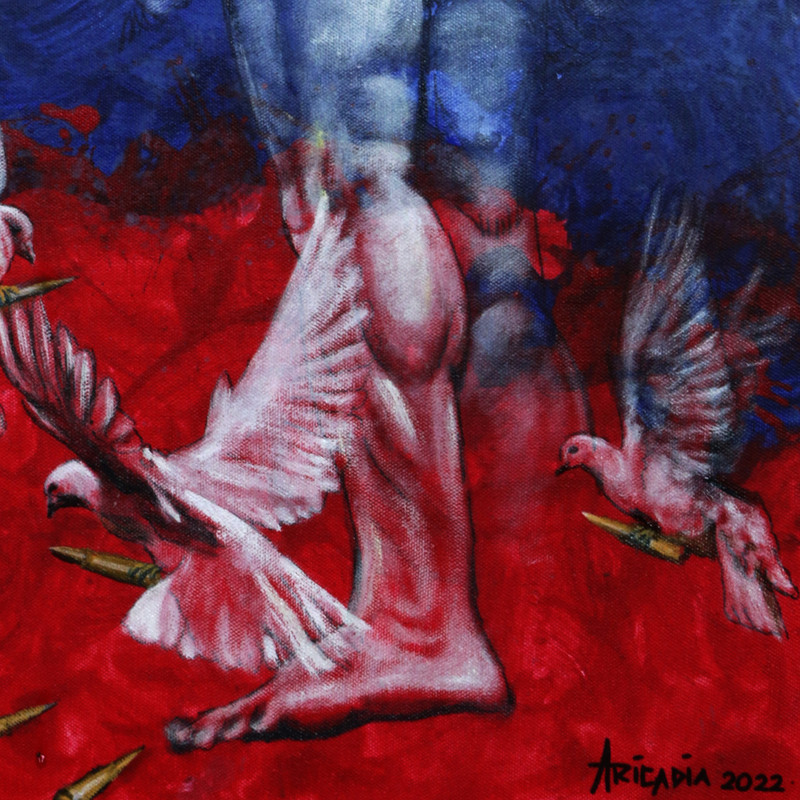 Bali's Aricadia creates a fascinating composition full of symbolism. He depicts a tall, muscular man surrounded by white doves removing bullets and land mines from a war zone. "In this world, we don't need any weapons to achieve a feeling of peace. We only need love and compassion," the artist reflects.