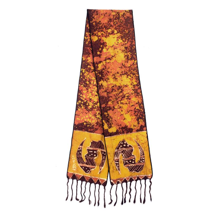 K. Baka combines pools of brown and golden yellow to create a beautiful batik scarf with African style. Ghana's famed gye nyame symbol adorns the ends, its rotating form meaning "I fear none except God." Known as an adinkra symbol, this image is revered throughout the country.