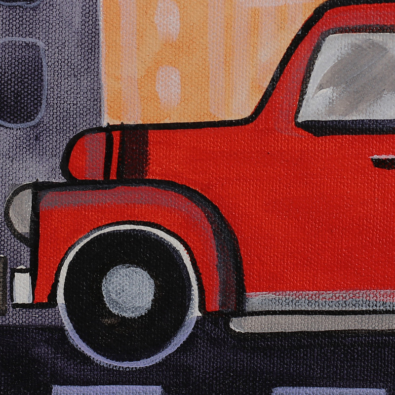 The urban lifestyle can be fast-paced and practical, but when the city streets are bathed by the sun's orange light, artist Preeti Gupta sees a welcoming landscape where dreams come true. Adding a warm touch to the often cold cityscapes, the artist uses acrylic on canvas to create this impressionist painting depicting a truck heading home while enjoying the magnificent sunset that decorates every evening in the metropolis.