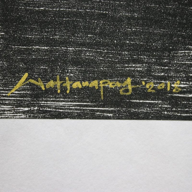 Inspired by the romantic air of the full moon, Thai artist Det paints this lovely composition. In black and white, an elephant is captured in a realist style, opening its mount wide and lifting its trunk towards the sky against the Thai landscape. The full moon is captured in gleaming gold foil.