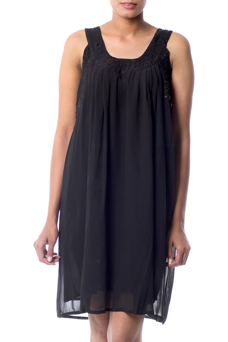 Backed by our 100% Happiness GuaranteeSilk georgette in midnight black becomes an elegant dress by Anant Jain. Beadwork and sequins adorn the yoke and straps, and continue down each side. Graceful smock styling and an elasticized back make the frock as comfortable as it is chic.