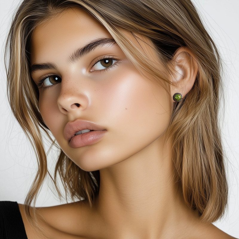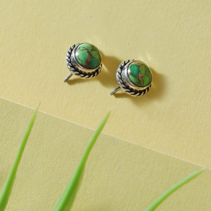 The Verdant Radiance green turquoise stud earrings I ordered are even prettier than I thought they would be. The earrings look great with a pair of tiny, multi-color Native American stud earrings I own that have some green in them (I have several piercings in each ear). If youre looking for elegant jewelry that will liven up your wardrobe, these earrings fit the bill. The veins in the turquoise give the earrings additional appeal.