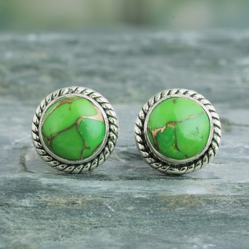 Enveloped in an argent twist, cool green gemstones reveal warm, coppery veins. Neeru Goel presents these beautiful stud earrings with composite turquoise. The pair is crafted by hand of sterling silver.
