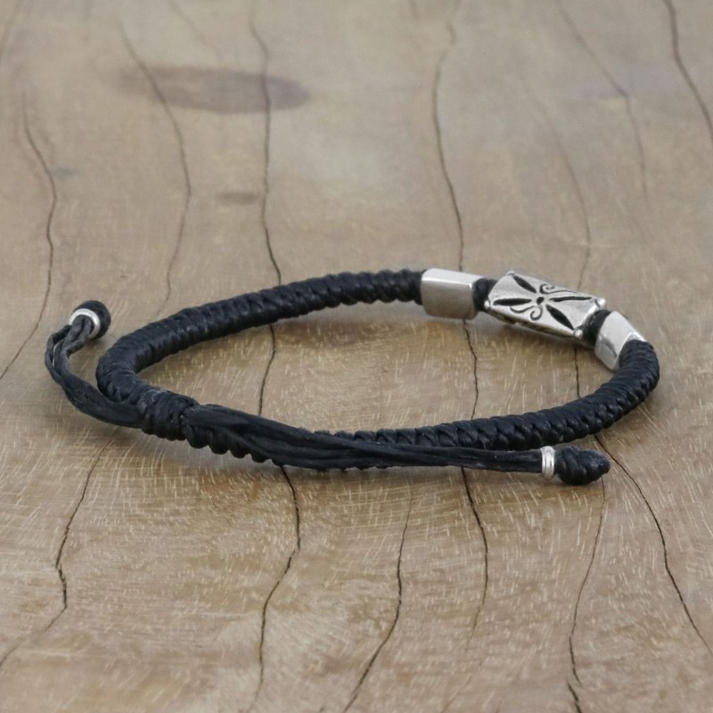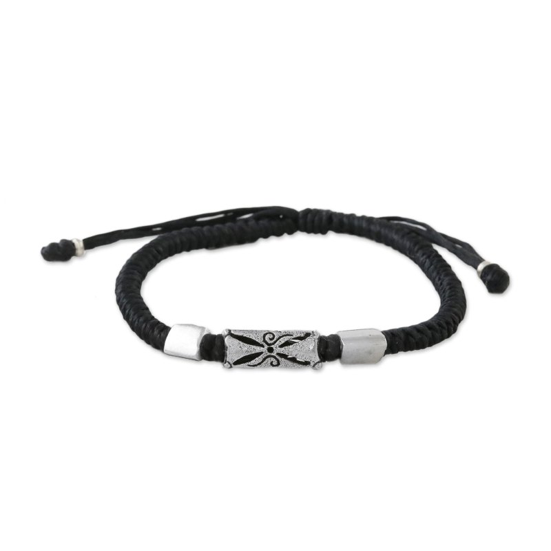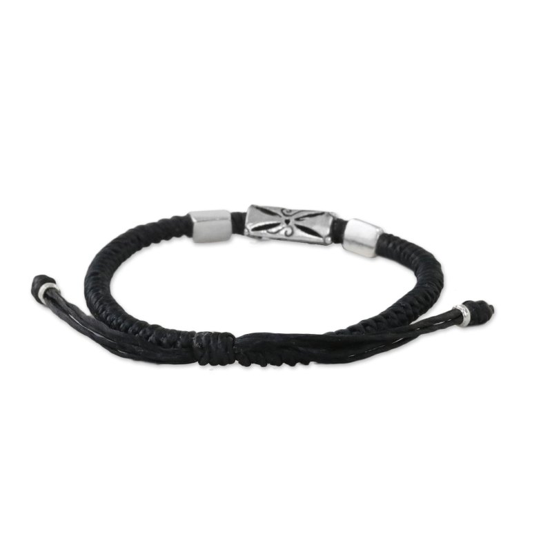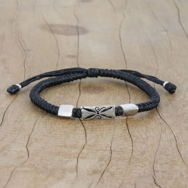Napapat of Thailand utilizes the unique silversmithing skills of Karen hill tribe artisans in creating this bracelet. The olive green cords are hand-braided, and then adorned with triangular 950 silver beads. The central bead features etched and carved motifs. A sliding knot ensures the perfect fit.
