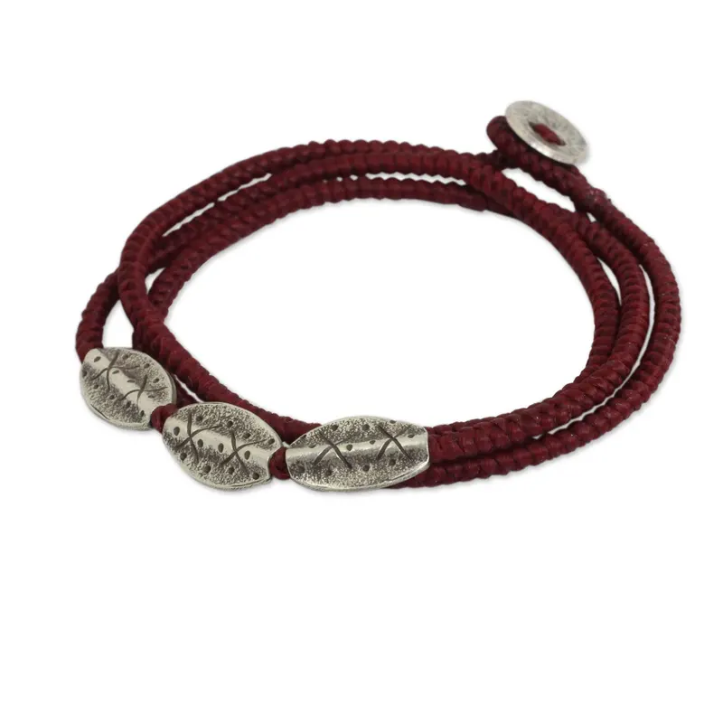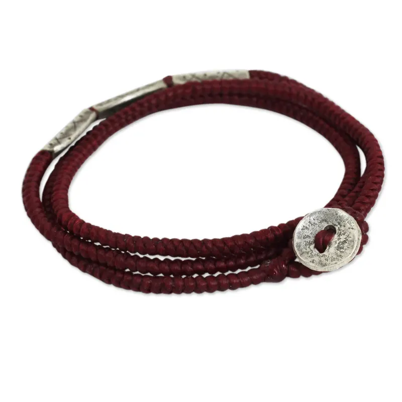 Artisan Napapat of Thailand presents a cord bracelet with minimalist hill tribe style. The cherry-red cord bracelet wraps around the wrist and features Karen hill tribe oval silver beads with stamped patterns and an oxidized finish. The bracelet closes with a silver button.