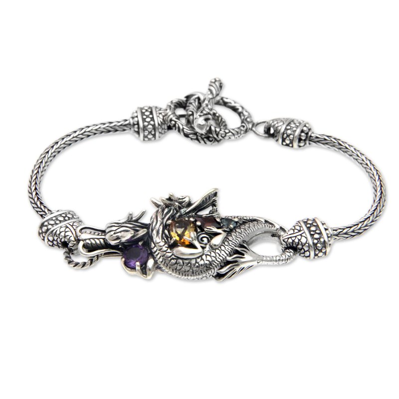Fiercely protective, a Balinese dragon guards a gemstone treasure trove. Kadek Hendra crafts this beautiful bracelet to showcase blue topaz, citrine, garnet and amethyst. The colorful stones total 1.5 carats.