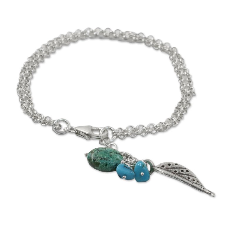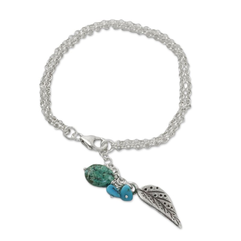Crafted of silver by Karen hill tribe silversmiths, a lively leaf dangles from this Thai bracelet. Withaya Cheunjit presents the bracelet, circling the wrist with two lengths of sterling silver rolo chain. Piece of reconstituted turquoise accentuate the leaf charm.