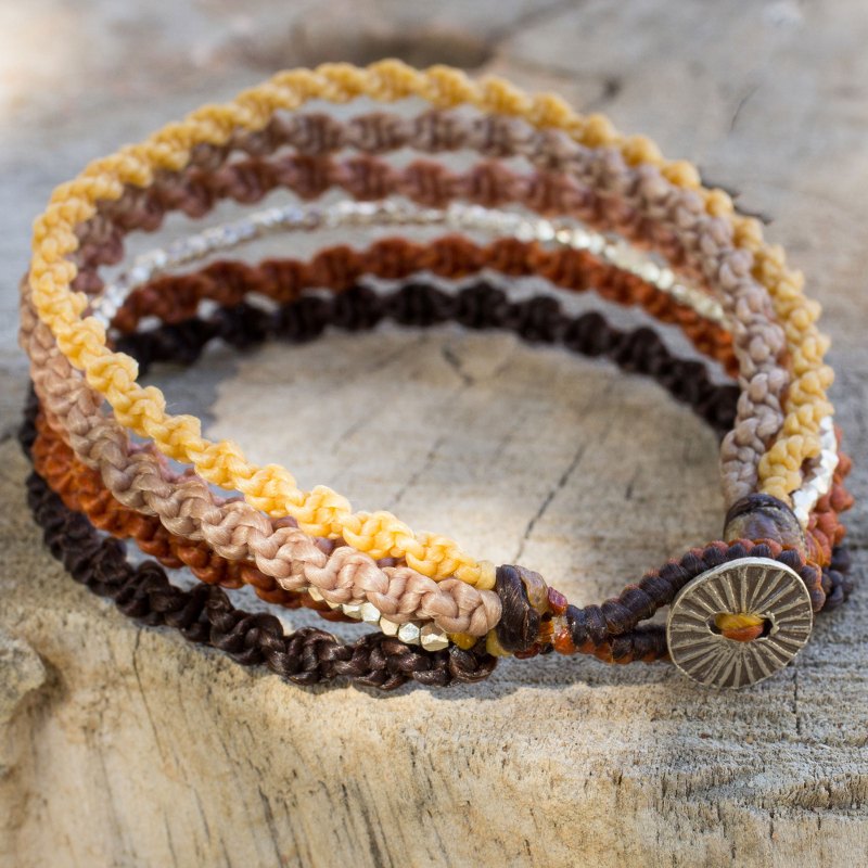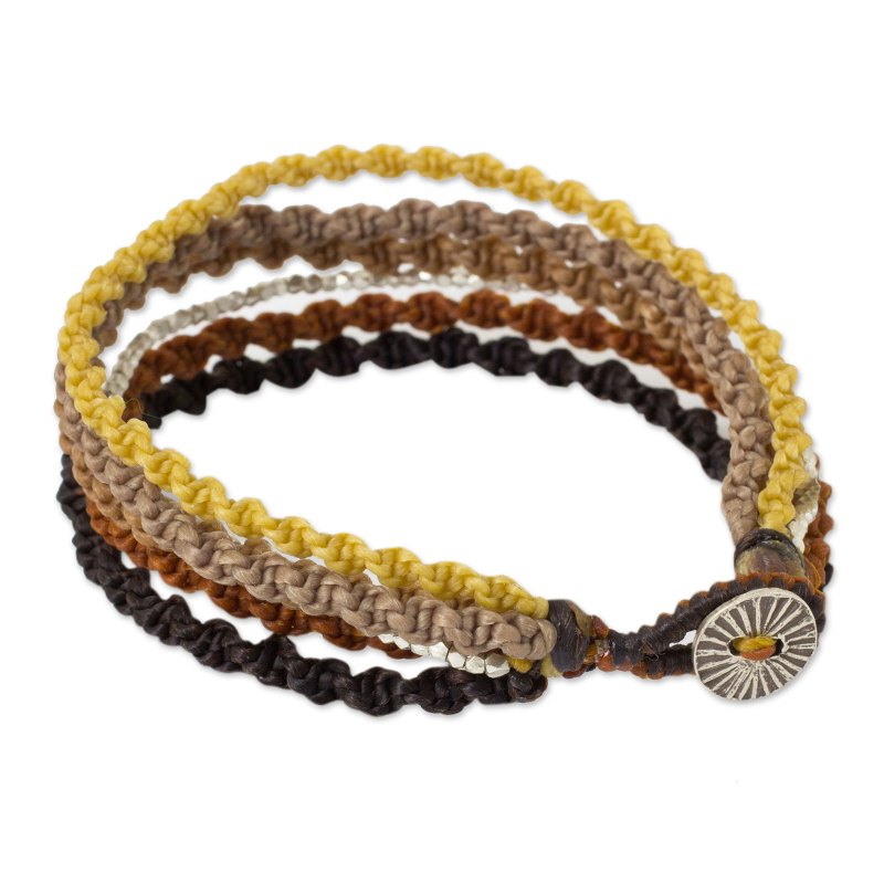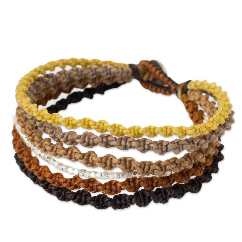 Shimmering beads of silver harmonize with browns and black in the design of this wristband bracelet. Thailand's Napapat crafts her design by hand with macramé techniques, resulting in a bracelet of wondrous allure.