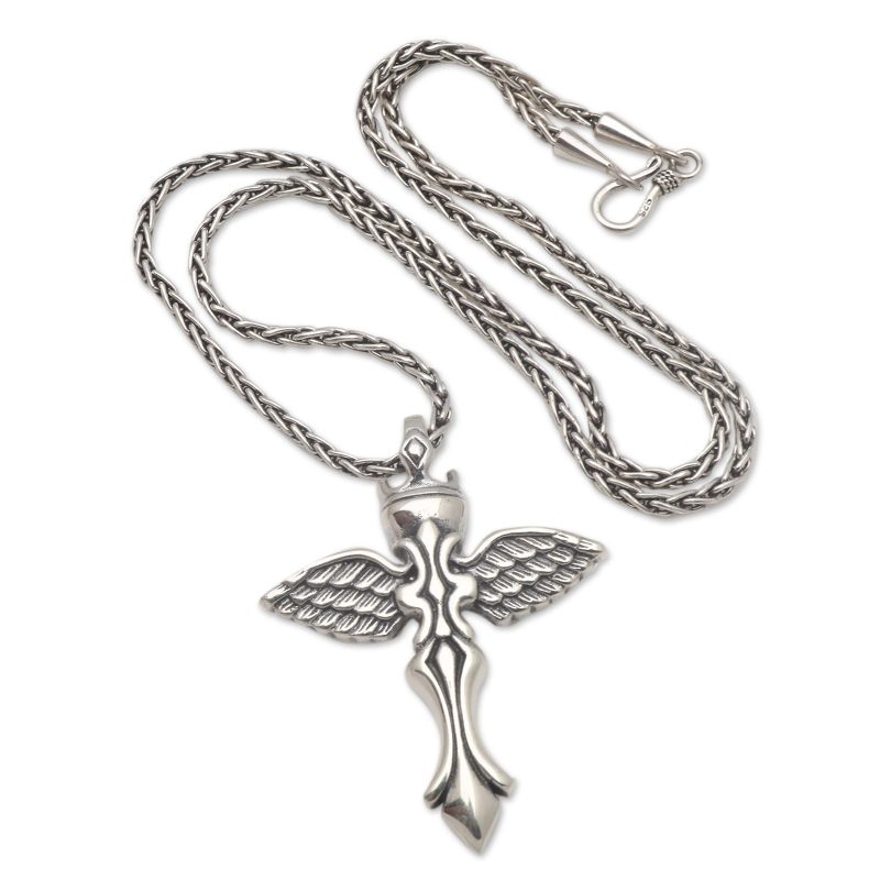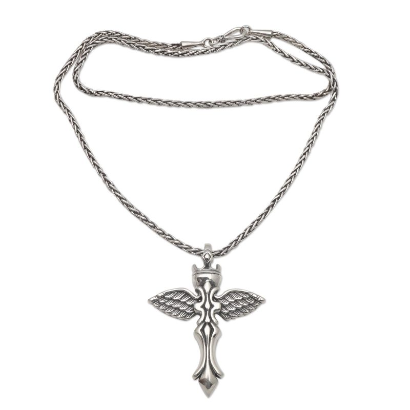 This unique pendant necklace, presented by Wayan Asmana in Bali, features a cross that is formed with spread wings and topped by a crown. The pendant is crafted of polished sterling silver and suspended on a sterling wheat chain.