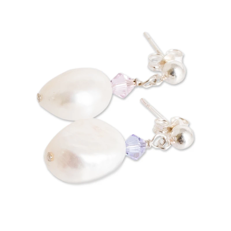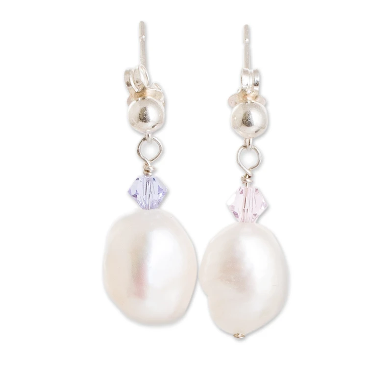 A symphony of elegance and individuality, this strikingly unique pair of dangling earrings is destined to become an instant favorite. Costa Rica's Miriam Bruten handpicks natural cream cultured baroque pearls, each bearing an alluringly unconventional shape. Embellished with sterling silver posts, the fabulous earrings are elegantly crowned by delicate crystal beads, one blushing in a graceful shade of pink while the other exudes a regal aura in majestic purple.