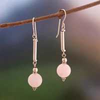 Spheres of rose quartz dangle like whispered secrets from sleek sterling silver bars in these dreamy dangle earrings from Peru's Teodoro Melendez and Family. Each piece is meticulously handcrafted to showcase the stone's natural blush and the metal's cool purity, creating a study in contrasts that feels both organic and refined. Their streamlined, feminine silhouette makes them effortlessly versatile, equally at home with weekend casuals or evening attire.