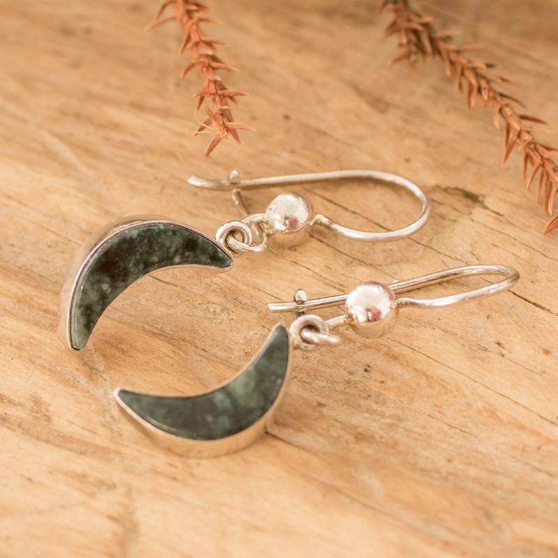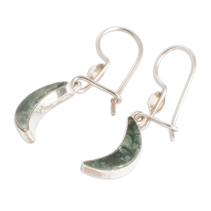Backed by our 100% Happiness GuaranteeBreathtaking crescent moons sculpted from dark green jade adorn these chic dangle earrings that steal the spotlight. Swinging gracefully from polished sterling silver frames and hooks, Guatemalan artisan Zandra Lorena Sajbin's fashionable earrings bring a touch of sophistication to any ensemble, infusing your look with unparalleled flair.