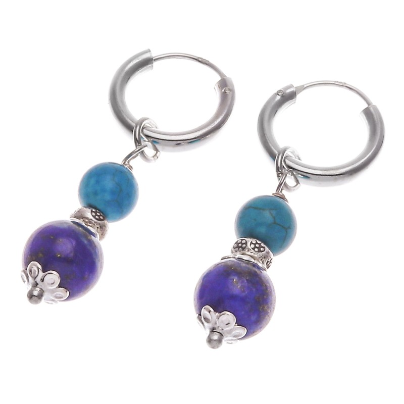 These extraordinary hoop earrings intertwine round lapis lazuli and reconstituted turquoise beads with hill tribe silver rondelle beads, infusing a pop of color into any attire. Thai artisan Tipa designs these striking sterling silver earrings that make a lasting impression and elevate any look to new heights of style.