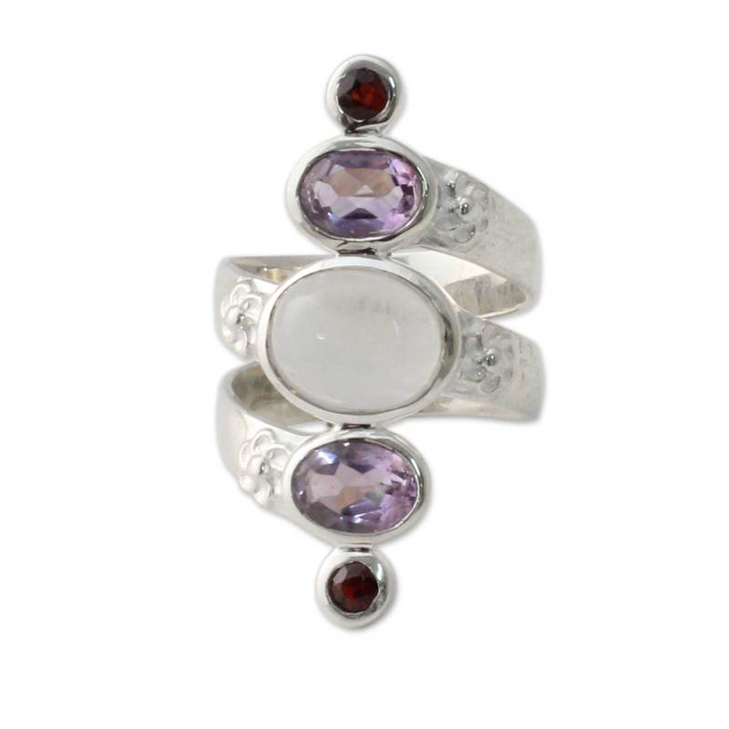 Backed by our 100% Happiness GuaranteeA band of hammered silver swirls around the finger in a gleaming sterling spiral. Centered by sleek rainbow moonstone, this handcrafted ring from Mahavir is spectacular. Amethysts and garnets totaling 2.2 carats complete the original ring design.