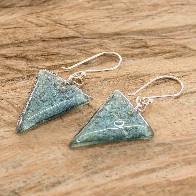 Working to promote ecological preservation, Guatemalan artisan Rosario Leiva uses recycled CDs to create a magnificent pair of dangle earrings. The recycled material is formed into triangular shapes with awe-inspiring designs in silver hues, dangling from hooks of sterling silver.