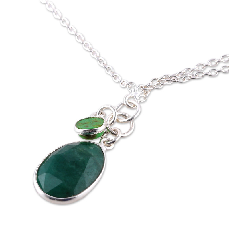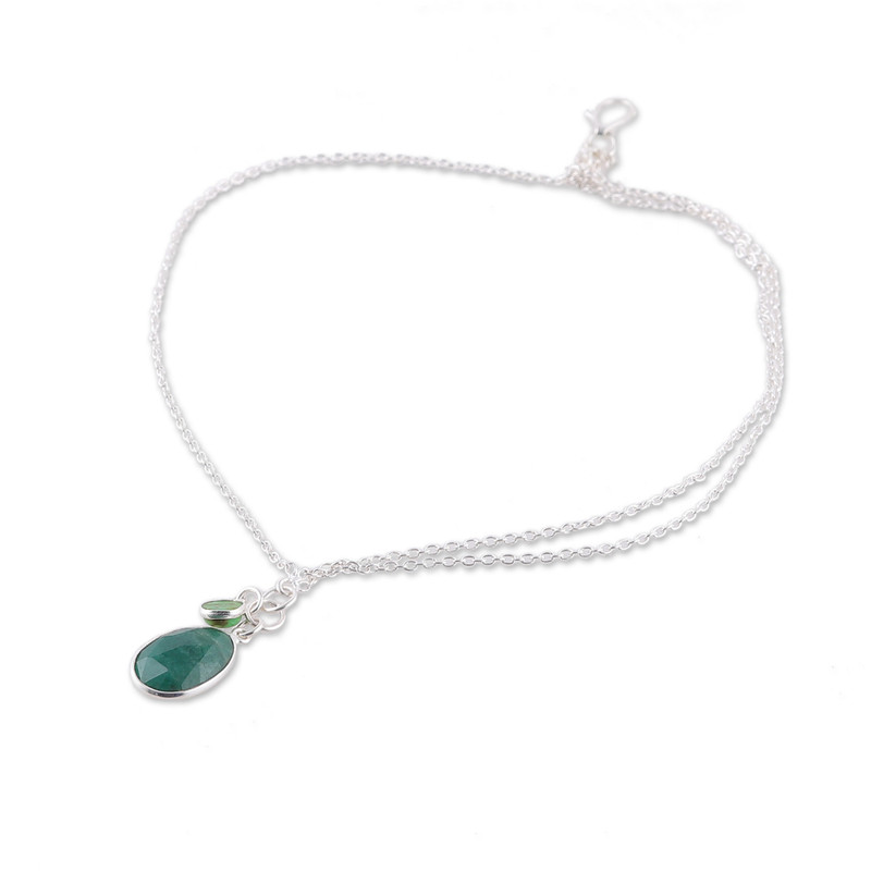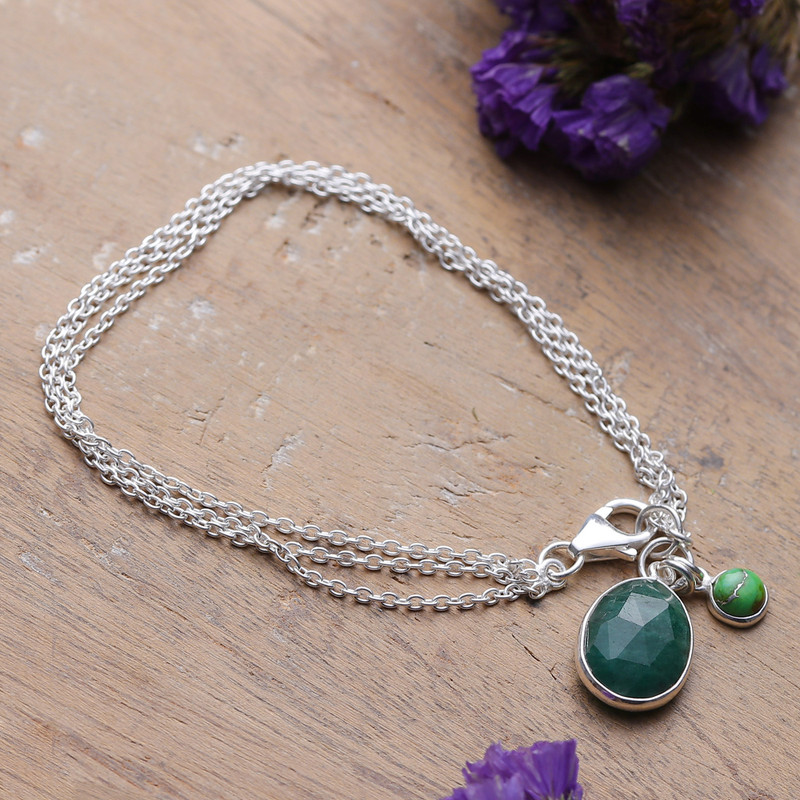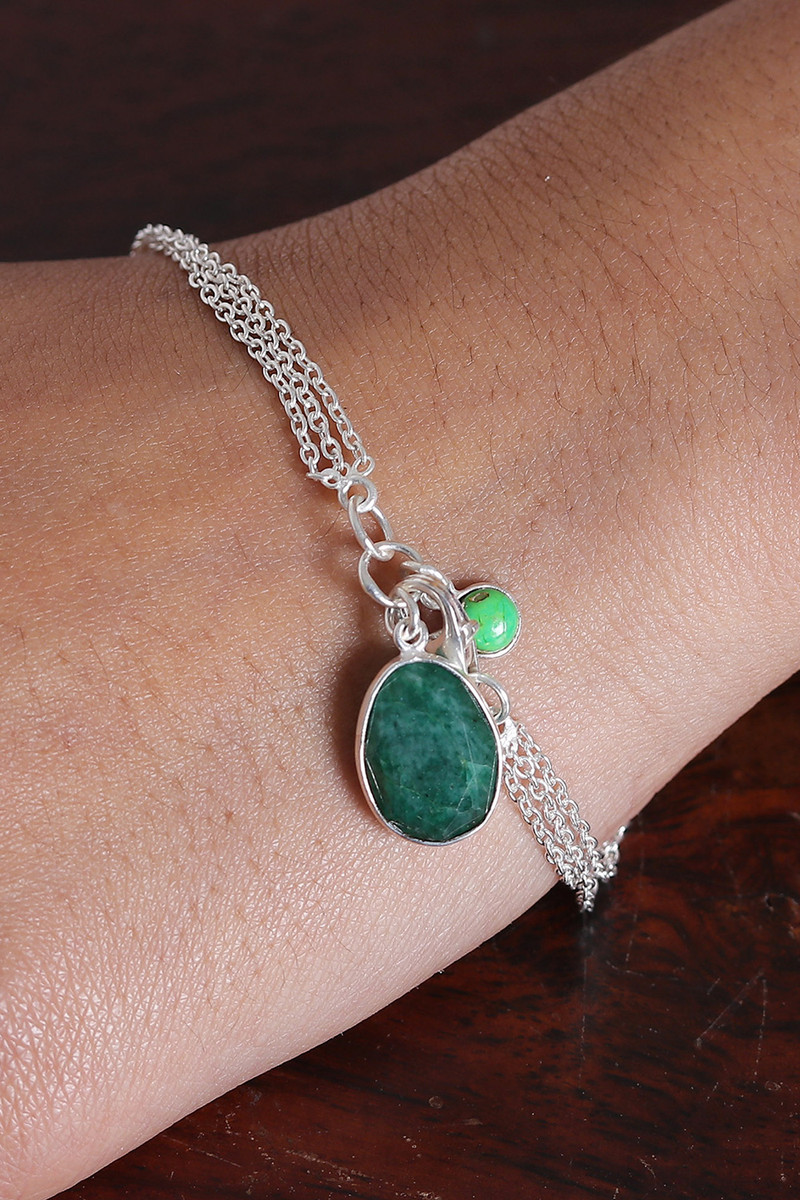 Designer Neetu Barathi draws inspiration from green—the color of prosperity, growth and hope—to create this gorgeous charm bracelet. Crafted from sterling silver in India, the piece boasts a sublime cable chain in a high polish finish. Embellishing the design, emerald and reconstituted turquoise gems dance at the bottom, totaling six carats.