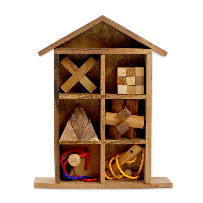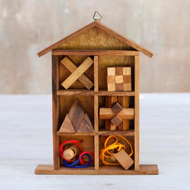 Thailand's Waraporn Khamsuk presents this collection of six puzzles to ensure you'll never be bored again. Crafted of raintree wood and rubberwood with colorful cord, the puzzles are each made of several pieces that move and interlock, featuring a variety of shapes and styles. A handy display box in the shape of a house finishes this entertaining home accent.