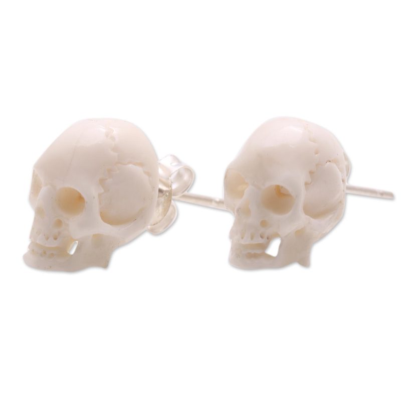 Inspired by the story of Trunyan Cemetery, this pair of stud earrings is hand-carved of bone to depict grinning skulls. Trunyan Cemetery is located in Bali, where locals perform open air burials in bamboo cages around a fragrant tree. The earrings adorn the wearer on posts of sterling silver.
