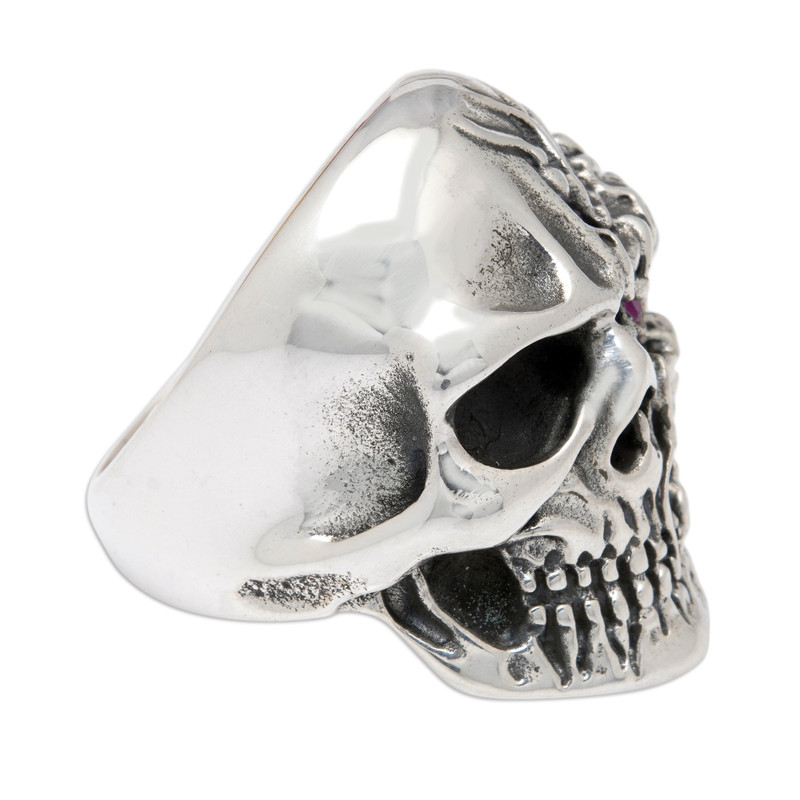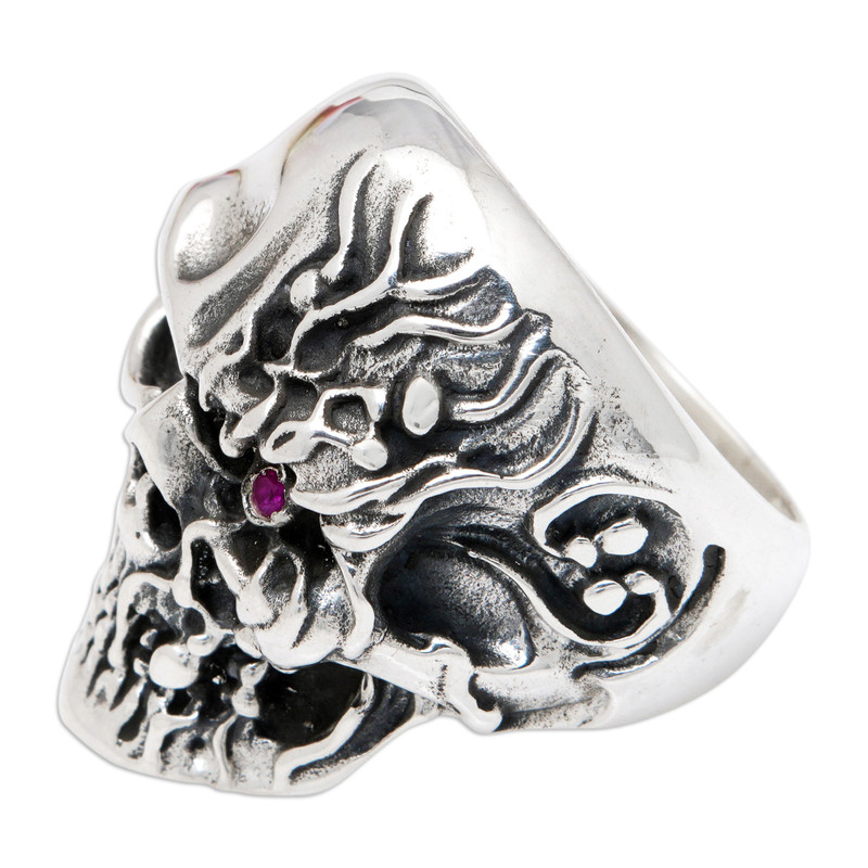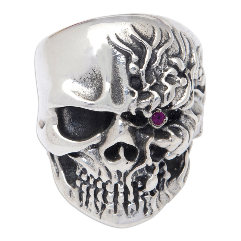 Backed by our 100% Happiness GuaranteeA mysterious call from the spiritual world emerges in Gede Agus Mahardika's newest creation. The Balinese artisan takes inspiration from gothic themes to create this sterling silver cocktail ring, whose polished skull shape invites you to a mystic realm, all accented with a luxurious cubic zirconia jewel shining with purple light.