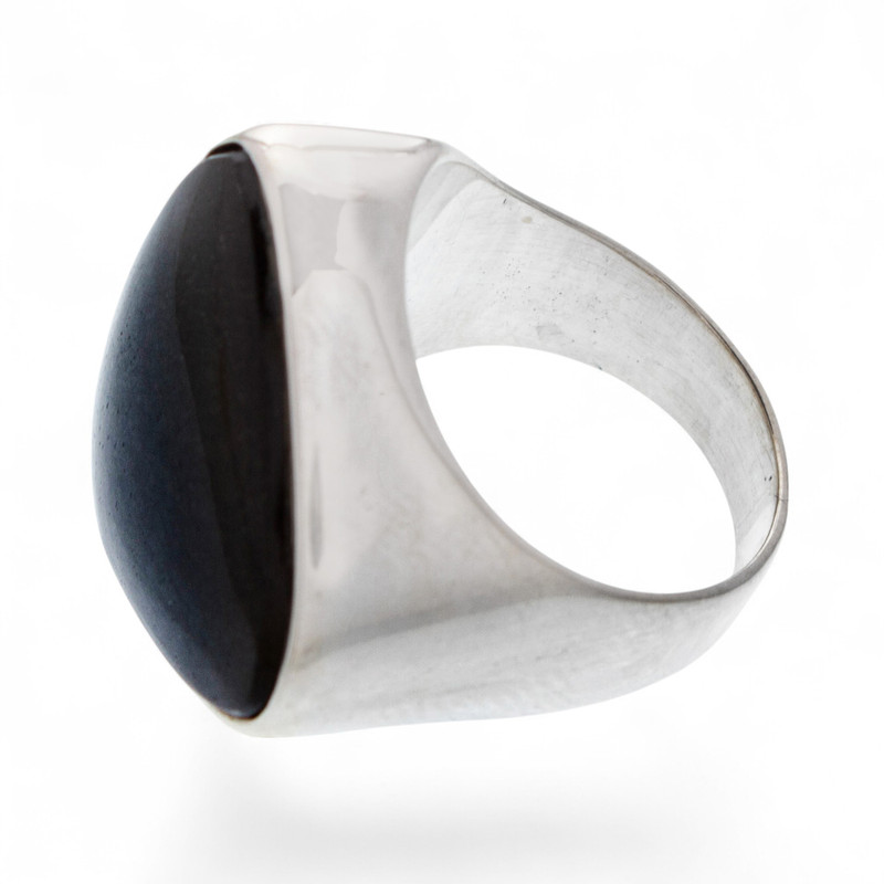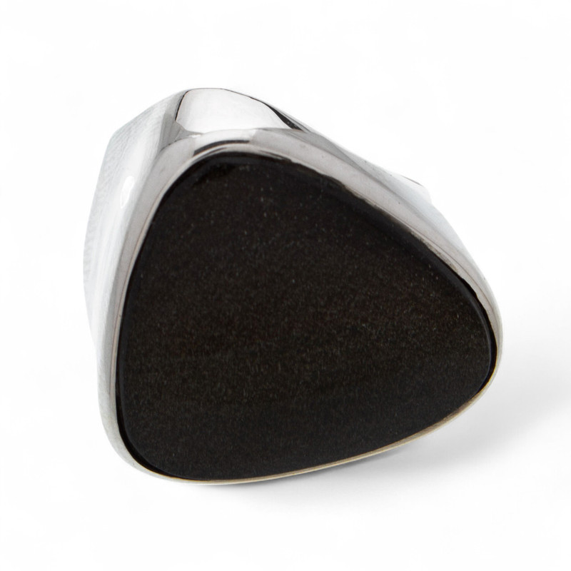 Bold, sleek and contemporary, this ring by Guillermo Arregui exalts both its earth elements. He works in Taxco's legendary sterling silver, crowning the polished design with a rounded triangle of black obsidian.