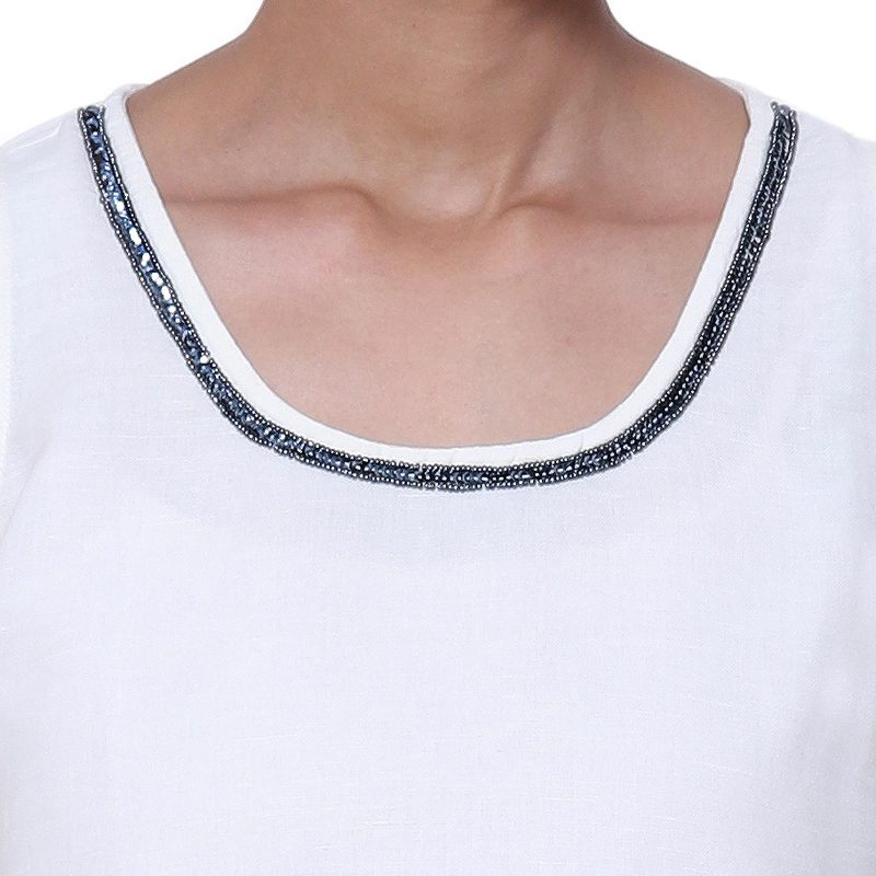 Cool and effortless, this sleeveless blouse from Shashi Sehgal is just what your closet needs. The ivory top is crafted from a lightweight cotton and linen blend and accented at the neckline with tiny beads and sequins. Dress it up with a smart jacket, or wear it alone to complement blue jeans.