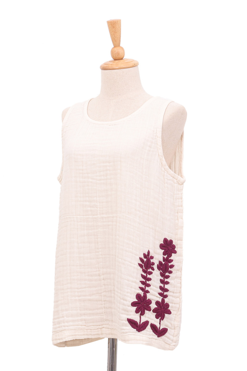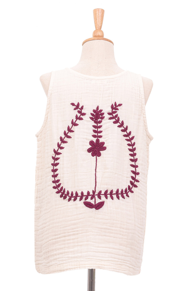 Hand-stitched on antique white double-layered crinkled cotton, the floral motif on Ying and Joy's summery blouse is a splendid example of Thai craftsmanship. Mulberry-colored flowers and vines decorate the front while a larger embroidered trellis pattern decorates the back. The top matches expertly with the mulberry tiered skirt, all part of Ying and Joy's stylish separates collection.