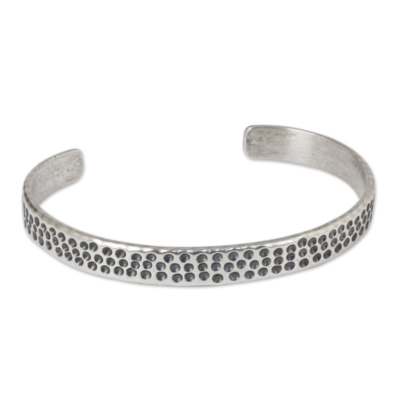 Backed by our 100% Happiness GuaranteeWithaya Cheunjit presents a cuff bracelet that showcases the beauty of handcrafted jewelry. Hammered dots suggest a forest path at the bracelet envelops the wrist with sterling silver's subtle radiance.