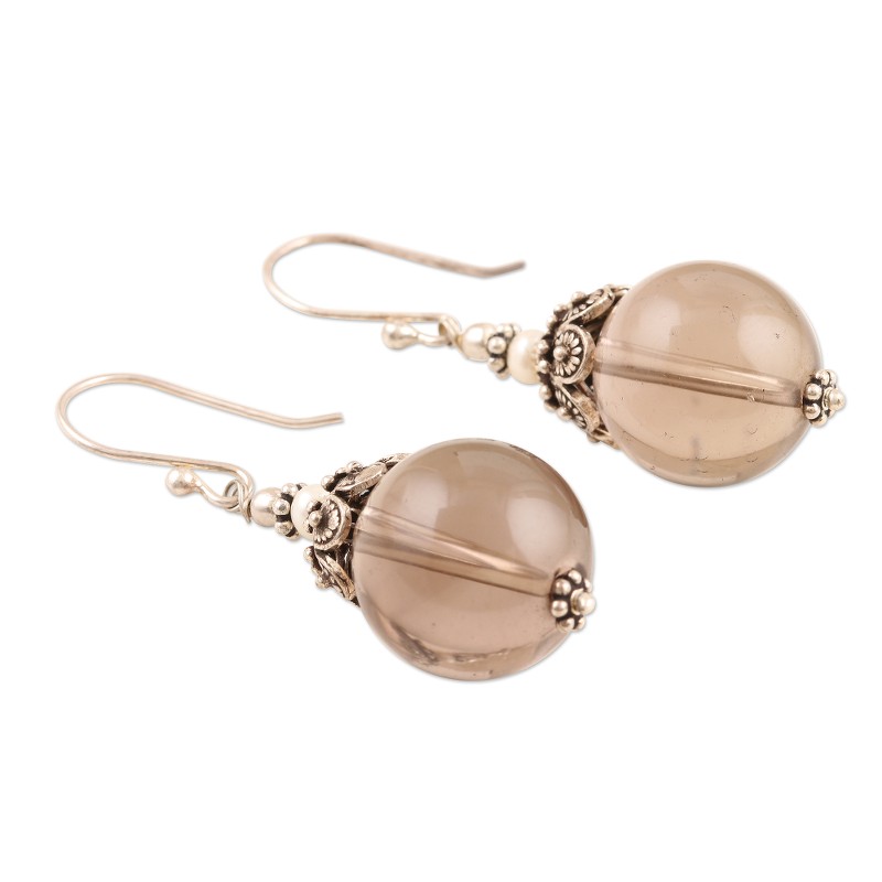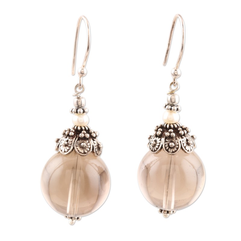 Celebrate a snowy winter evening in these stunning dangle earrings designed by India's Narayannii. The artisan nestles a cultured freshwater pearl between rows of sterling silver dot work, then adds a translucent smoky quartz globe below to complete the wintry look.