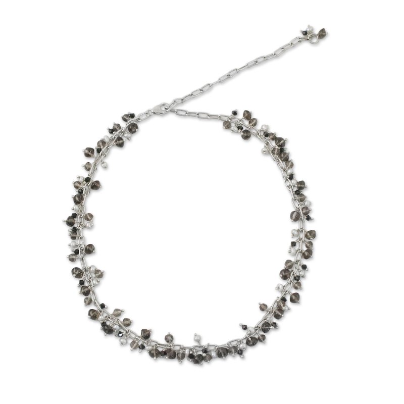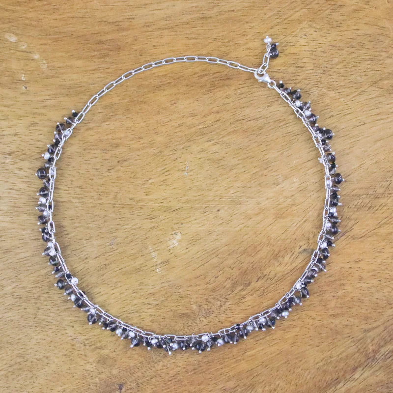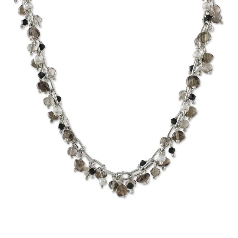 Combining the beauty of smoky quartz with glowing white cultured pearl and glass beads, this Thai necklace is presented by Withaya Cheunjit. It circles the neck with a gleaming length of sterling silver cable chain, completed with an extender chain.