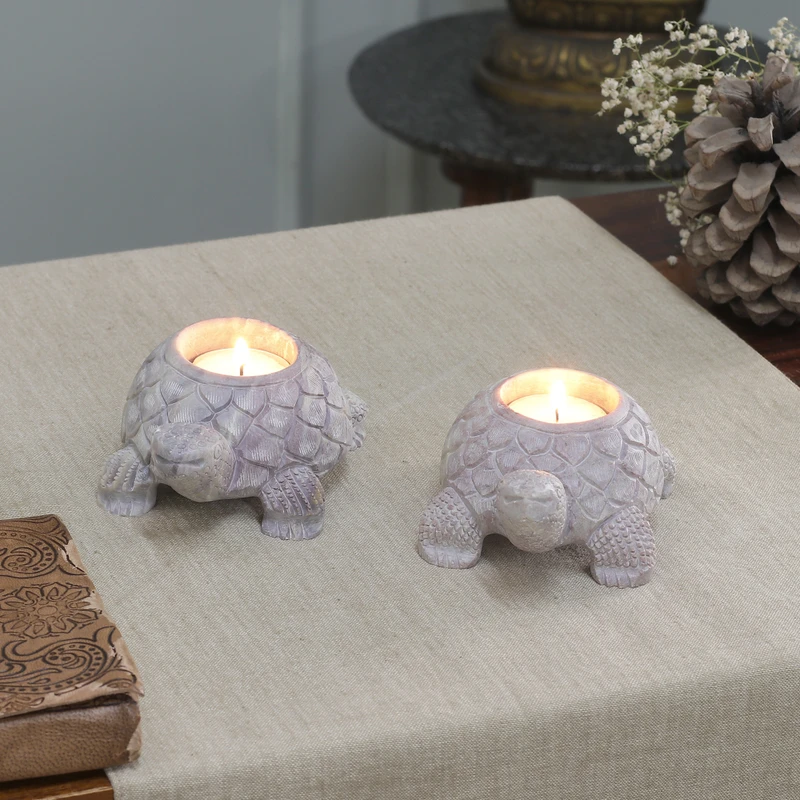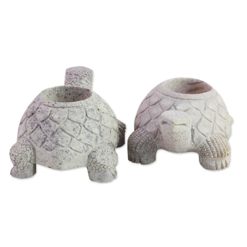 Cheerful terrapins carry tea lights in their shells as they walk steadily toward their goal. Hand-carved of soapstone, these turtle twins by Gulam Rasool make delightful candleholders.