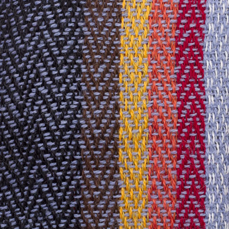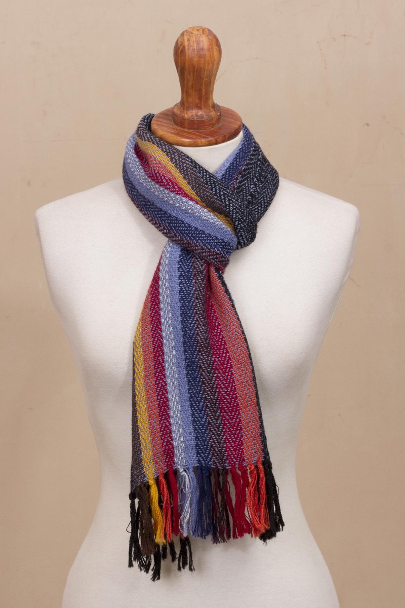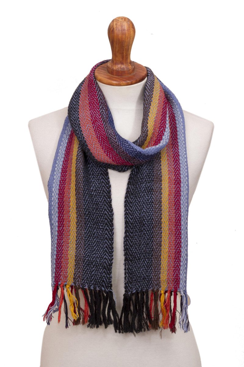 Vertical stripes in persimmon, crimson, goldenrod, and steel blue run down the center of a soft black and blue background in this eye-catching, sumptuously soft 100% alpaca scarf. A chevron weave pattern adds to the visual interest of the scarf. Members of the Ulloa Family of Peru hand weave the scarf on a traditional backstrap loom using time-honored techniques. The scarf is finished with fringe.