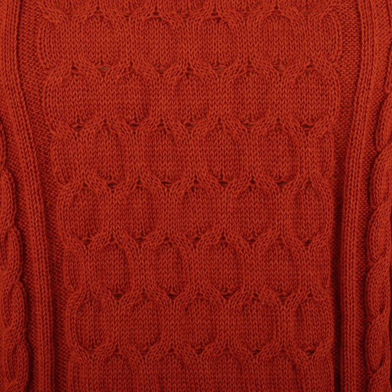 A classic cable knit sweater is reimagined by Cesar Cano of Peru. A honeycomb knit on the front and back is spliced between vertical cable patterns. A rolled neckline and rust color give the sweater a youthful update.