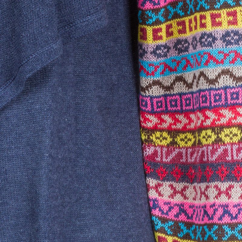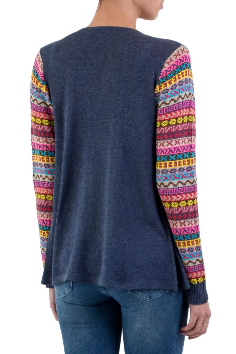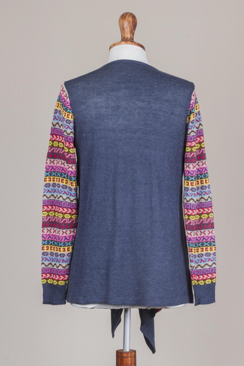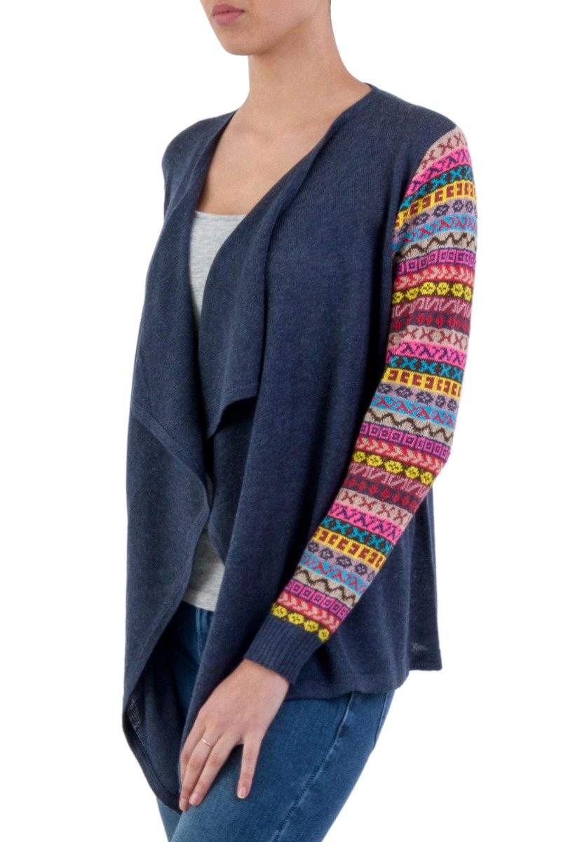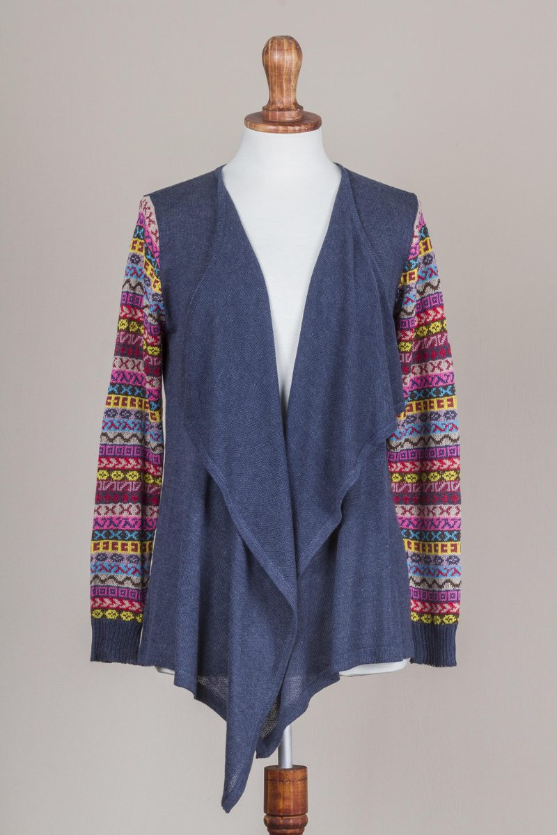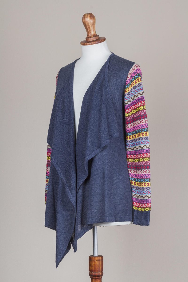 Comfort and style meet in this open-front cardigan from Peru. Slip the open-front cardigan on for your market stroll or evening walk. Designed by Fernando Cano, this cardigan features colorful striped sleeves knit with geometric Inca-inspired patterns and an open, flowing front. The color palette of rich blues, yellows, and reds make this a great sweater for all seasons.