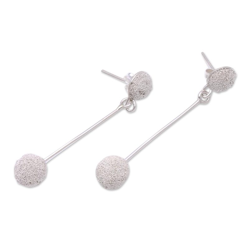 Backed by our 100% Happiness GuaranteeGlittering in the light, two sterling silver baubles are decorated with petite granules that result in a pleasing texture. Balinese artisan Anya creates these earrings, which dangle from sparkling posts on long silver bars.