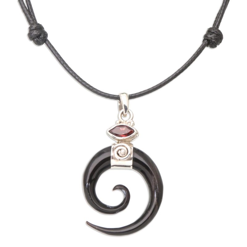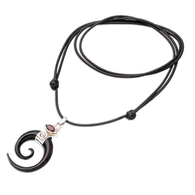 Backed by our 100% Happiness GuaranteeThe Kabbalah refers to the spiral symbol as a stairway to heaven, a motif often seen in many fields like clothing, pottery and of course jewelry. This stunning necklace features a spiral pendant hand-carved from horn whose motif is also recreated in a sterling silver accent topped by a shiny marquise garnet gemstone. Designed by Balinese artisan Ayu Ary, the necklace features an adjustable cotton cord so it can be worn by both men and women.