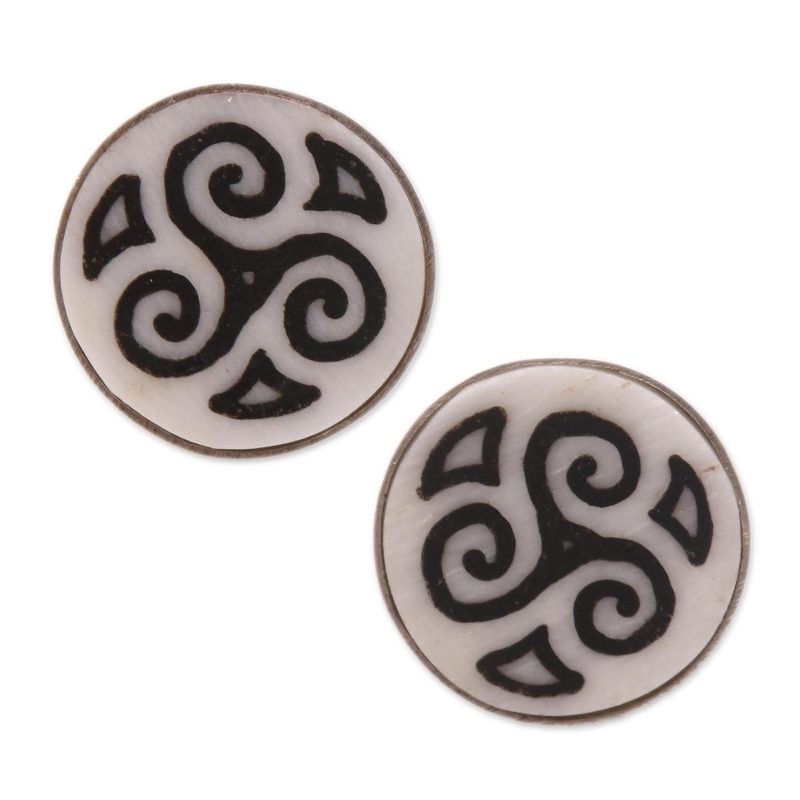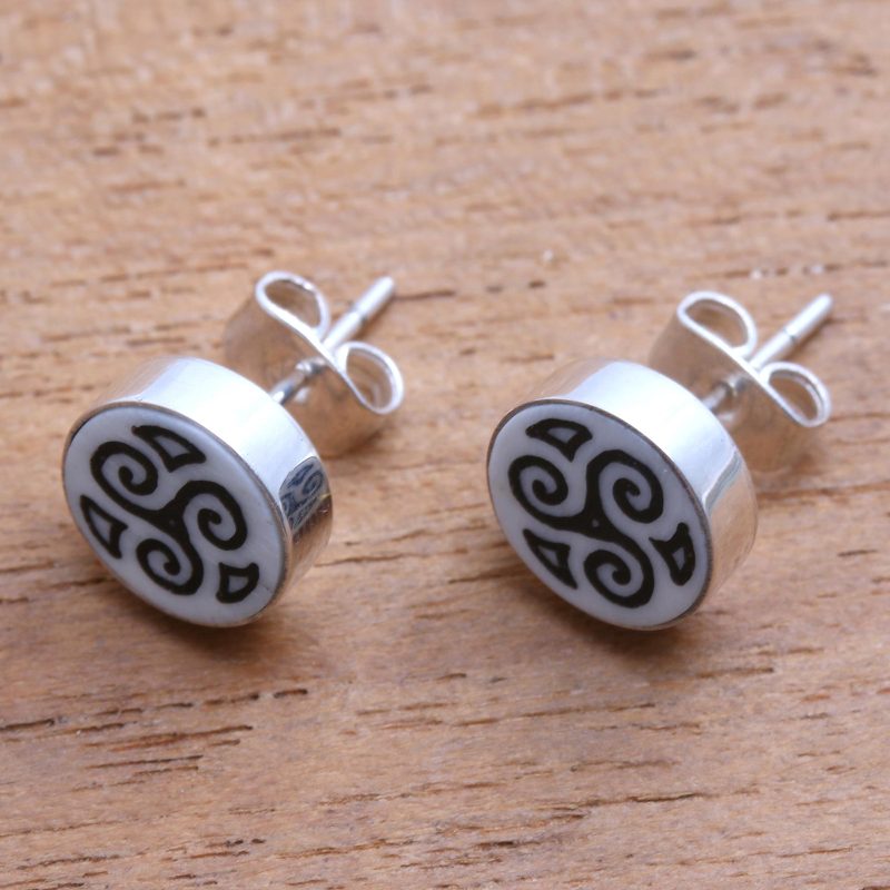 Backed by our 100% Happiness GuaranteeDesigned by Made Wardika in Bali, these stud earrings will add a touch of symmetry to your wardrobe. Framed by sterling silver, circles of white bone feature spiraling tribal motifs that are inlaid in black bone, carefully carved by hand.