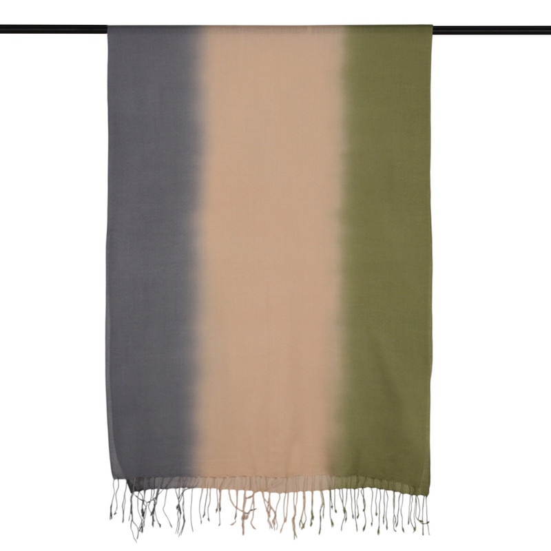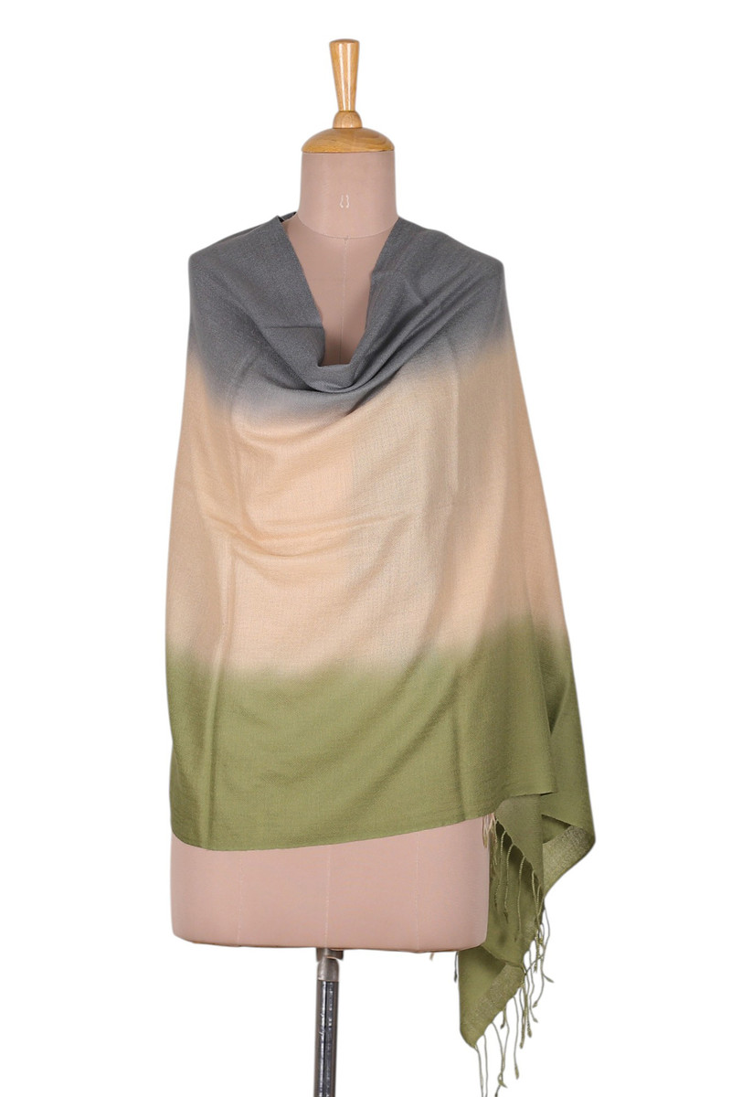 The harmonious green of the spring merges with shades of ivory and grey, making your ensemble a distinguished piece in honor of nature. Artisan Shahid of India uses delicate wool textiles to create this striped shawl, whose colors fuse through an ombre pattern. Ideal for crafting your own fashionista statement, the shawl has charming fringes.