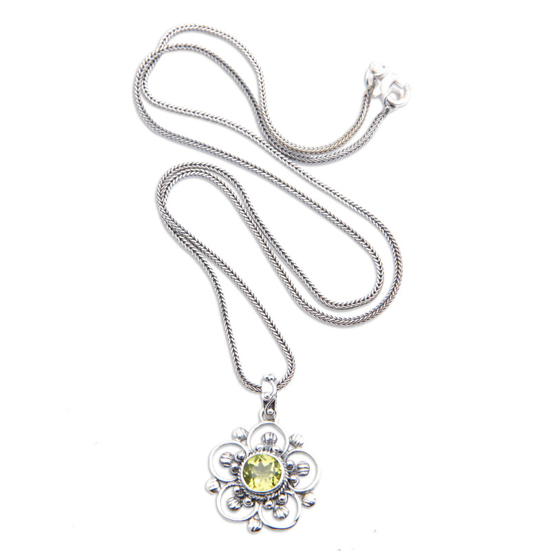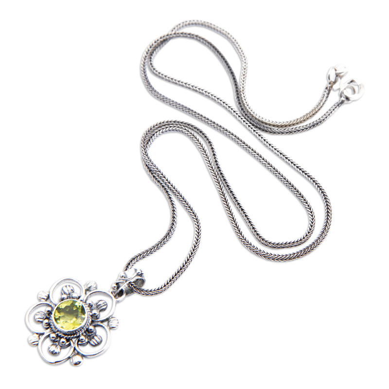 Blooming as prosperously as Bali in spring, this floral pendant necklace by Nyoman Rena is here to enrich your days with a sweet and harmonious essence. The artisan works with talent and dedication in each detail that composes this glorious sterling silver accessory, whose flower-shaped pendant boasts the beauty of a natural peridot stone as a symbol of good luck.