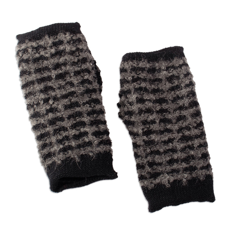Backed by our 100% Happiness GuaranteeMysterious, elegant and charming—the nights in the Andean region are unforgettable, and so is the beauty of these alpaca blend fingerless mitts crafted with a glorious look. As a creation by master artisan Alfredo Falcon of Peru, these accessories feature a soft texture accented by recycled polyamide threads, allowing a warm feeling perfect for a chilly winter outing. The square pattern combines black and grey hues, creating a luminous illusion.